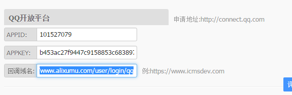 网站回调域 :https://www.icmsdev.com/user/login/qq;https://www.icmsdev.com/public/api.php?app=user&do=login&sign=qq